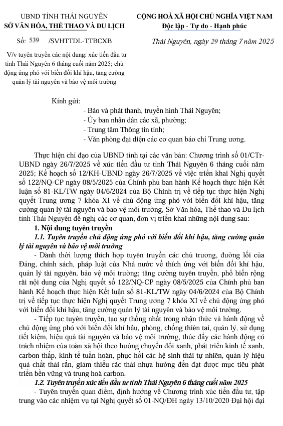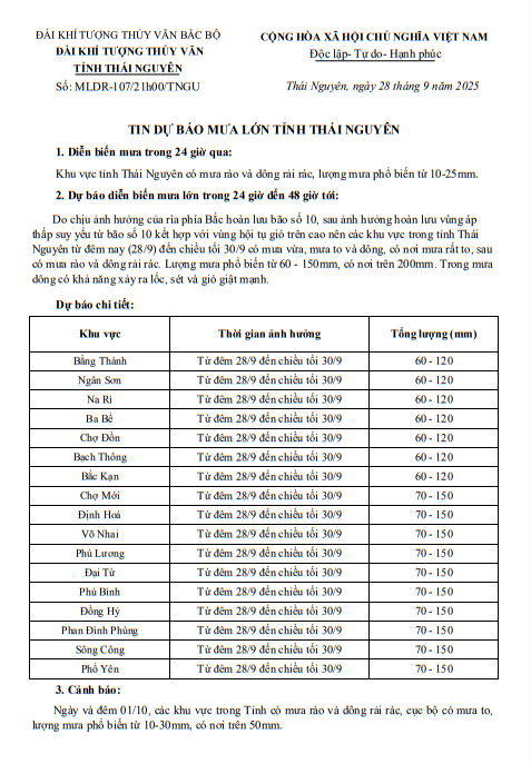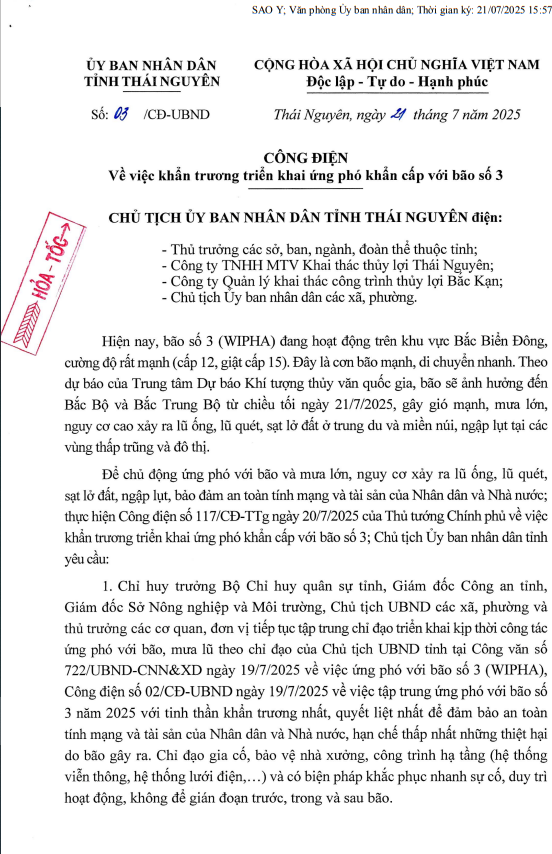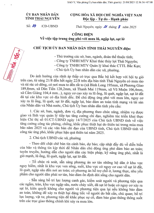 Công điện số 04/CĐ-UBND ngày 21 tháng 8 năm 2025 của Uỷ ban nhân dân tỉnh Thái Nguyên về việc tập trung ứng phó với mưa lũ, ngập lụt, sạt lở