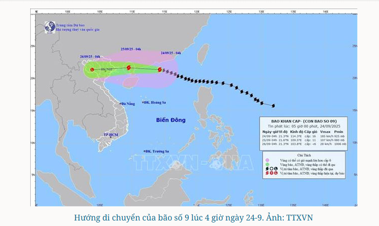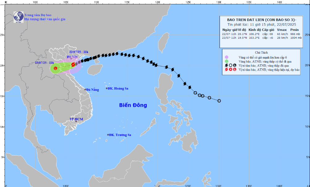 Theo Trung tâm Dự báo khí tượng thủy văn Quốc gia, sau khi đi sâu vào đất liền khu vực Ninh Bình, Thanh Hóa, chiều tối 22-7, bão số 3 đã suy yếu thành áp thấp